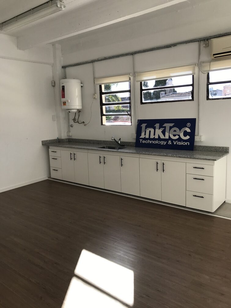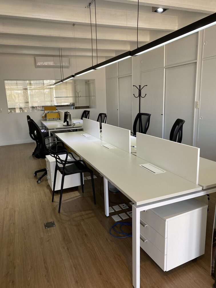 Sector PB, En el depósito se ejecutaron divisiones en durlock para generar un gran espacio de trabajo con escritorios , otro para entregas ,sector de baño y cocina.